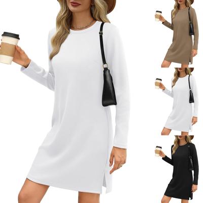 Women's Casual Round Neck Hem Slit Long Sleeve Dress