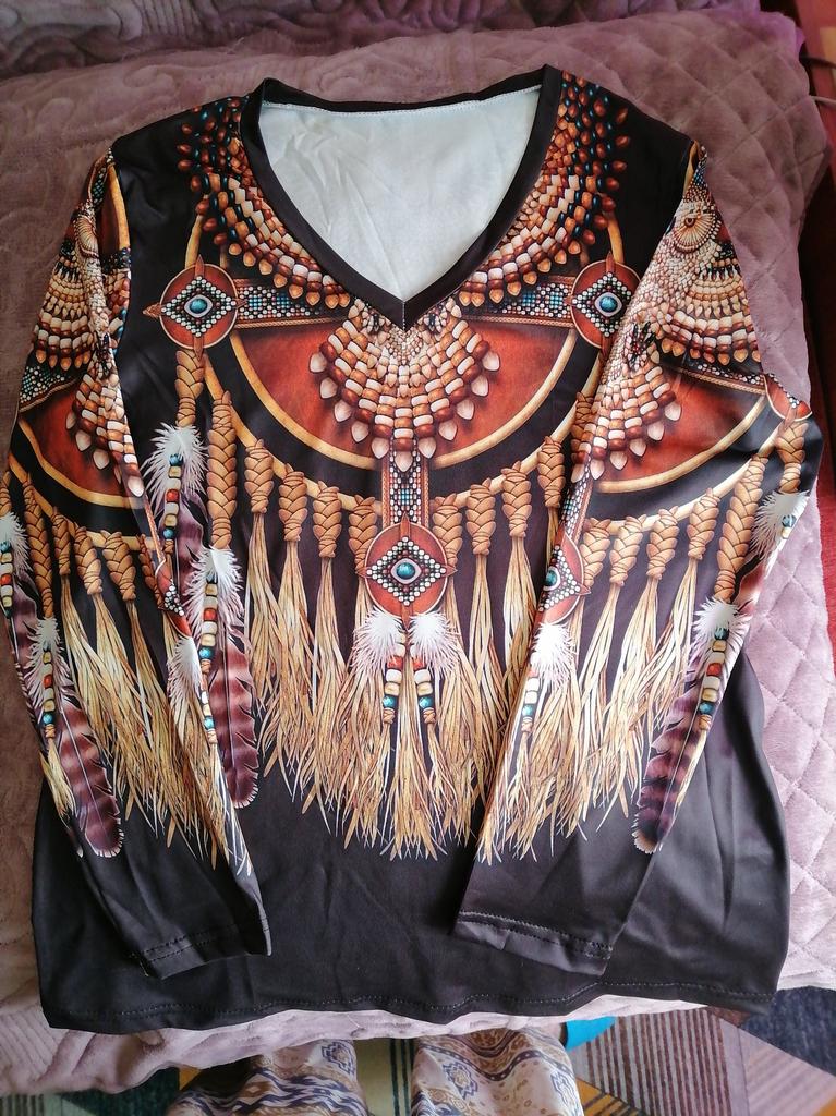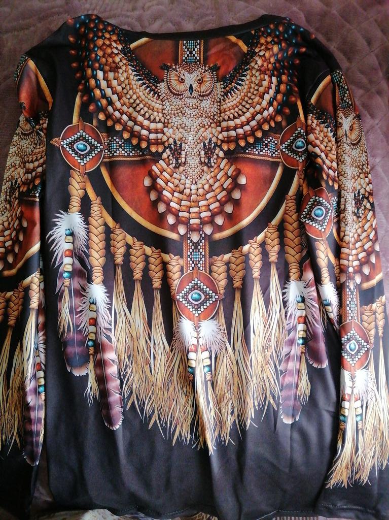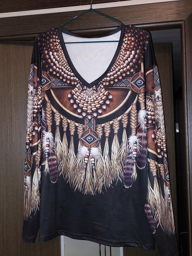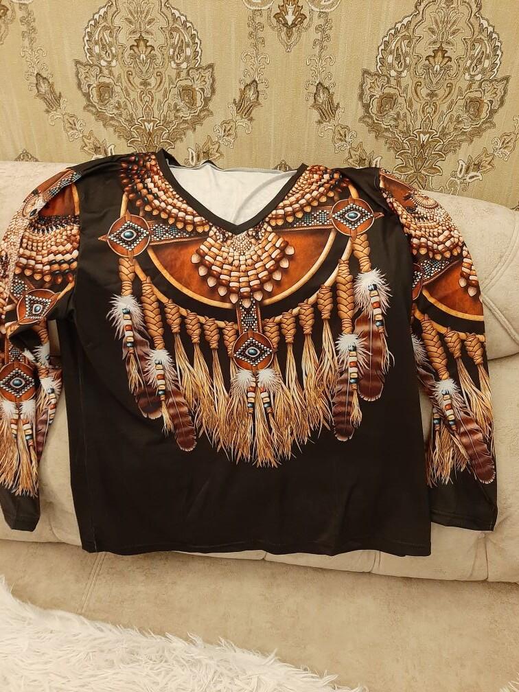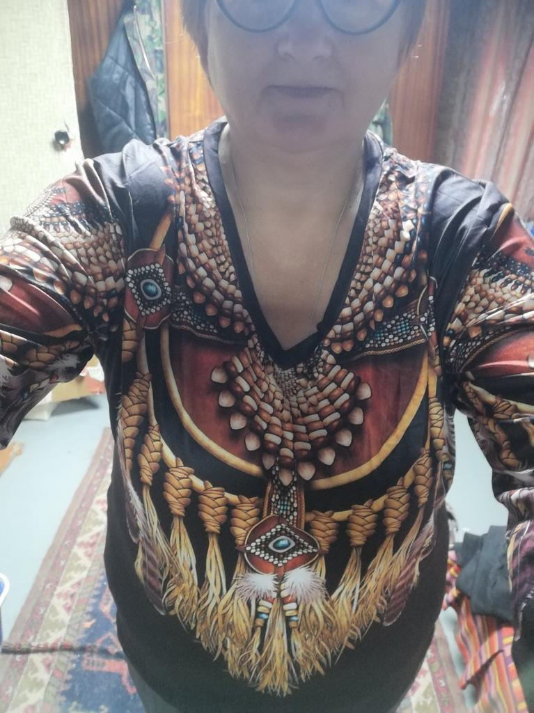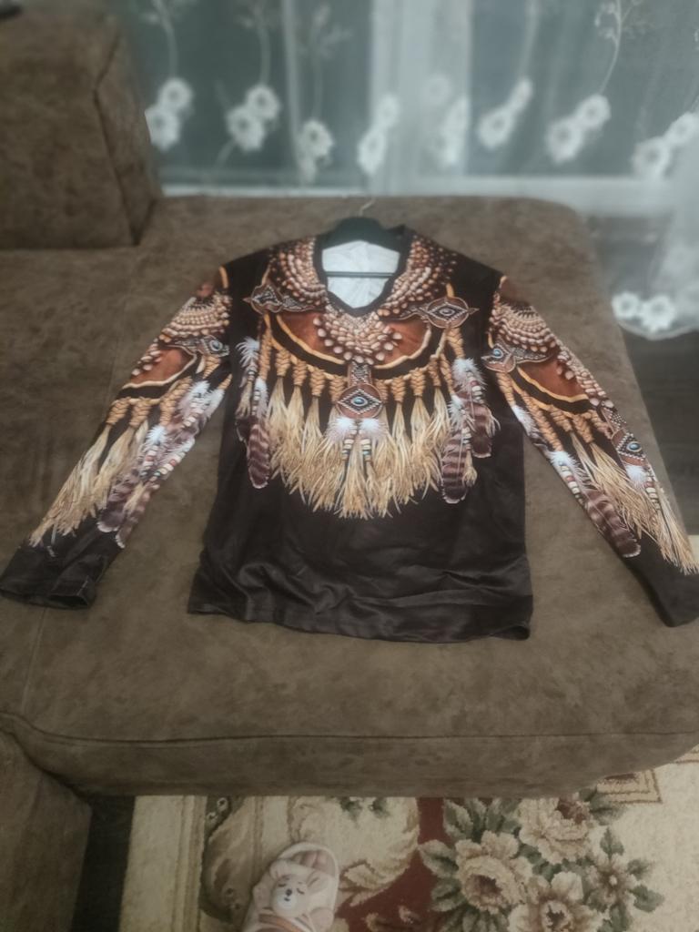 Original blouse like the Indians. The print is very bright on a dark background, the fabric density is thin. You can wear it not only to a party, to various events, but also for a walk in the park, you will stand out from everyone, that's obvious! Item for youth, and for shock value! LIKE!