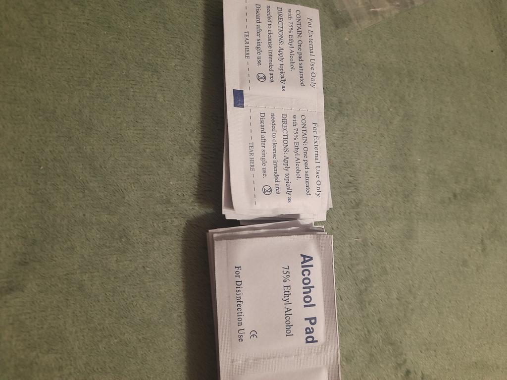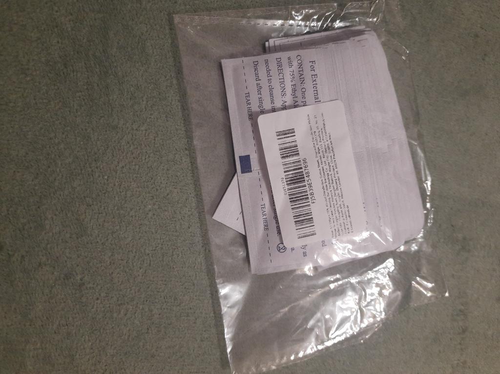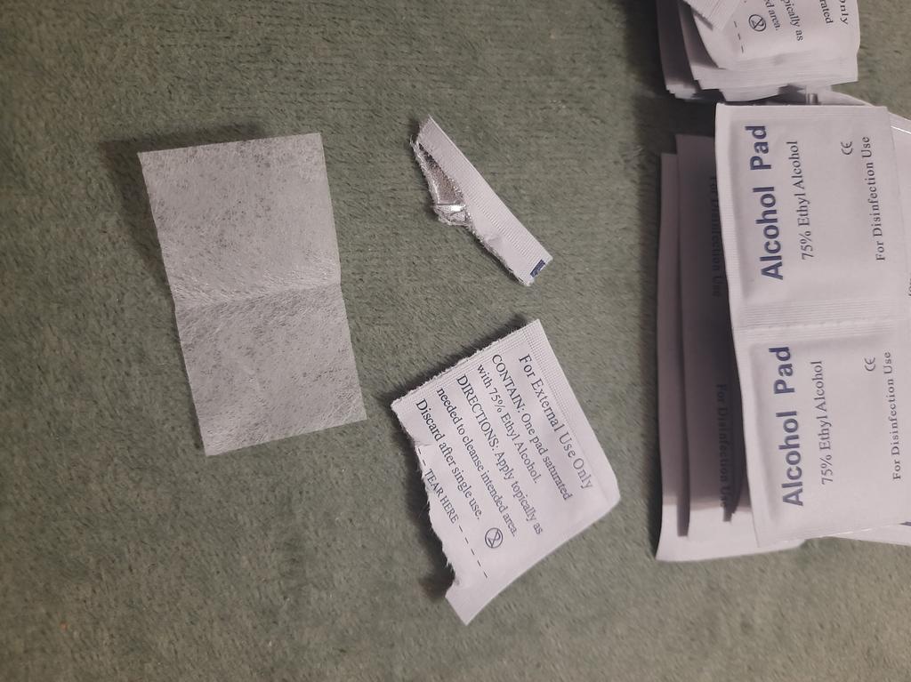 Ordinary alcohol wipes, only much cheaper than in pharmacies
