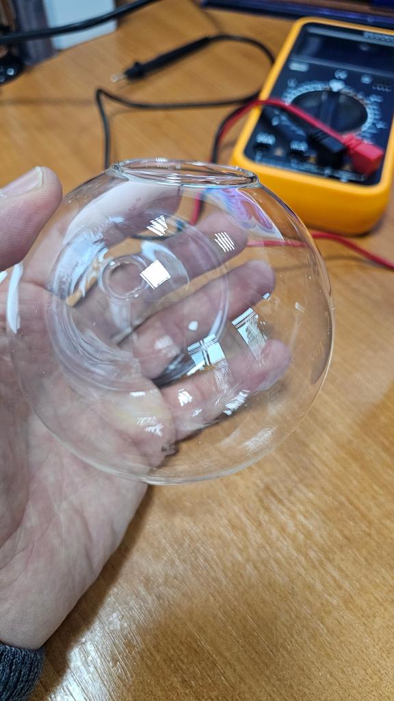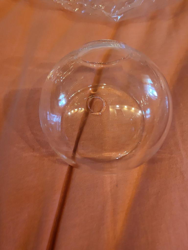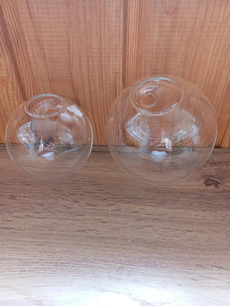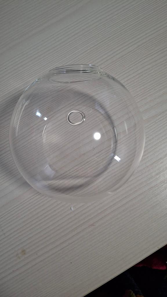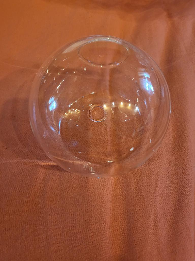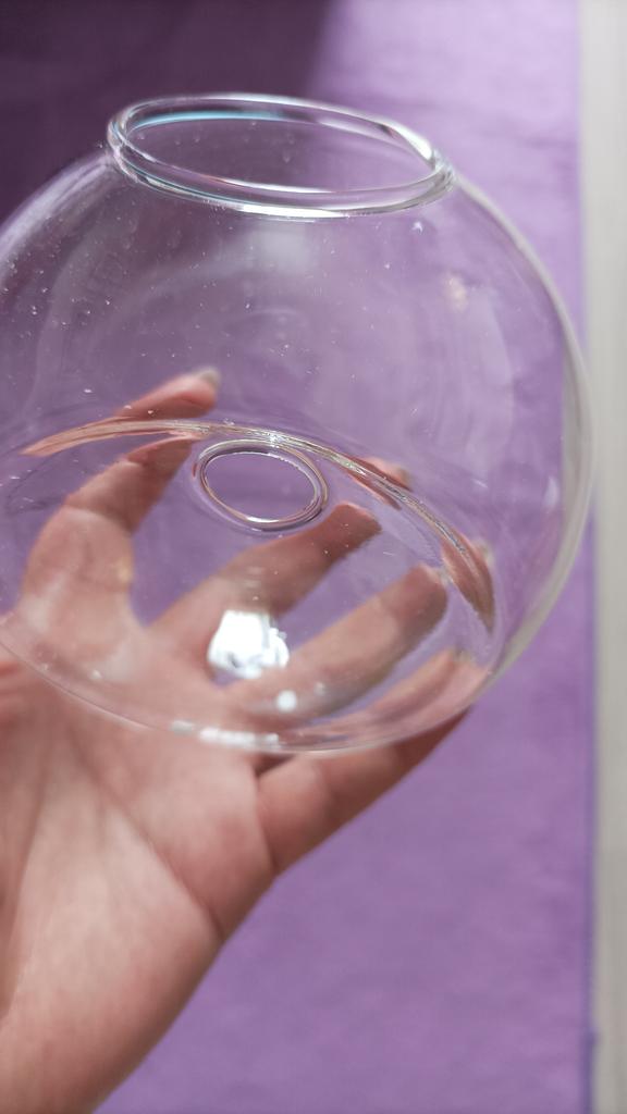 Thank you very much for the packaging...everything arrived intact, the vase is rounded, not flat, without mountings (no screw*), in the middle there is a hole in the glass for mounting