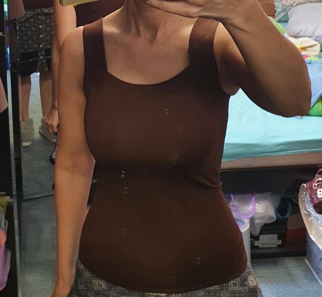 The tank top is excellent, the size was right this time, only there is an unpleasant smell, but otherwise it is not felt on the body, under tight-fitting clothes you can without a bra, it supports the breasts more or less