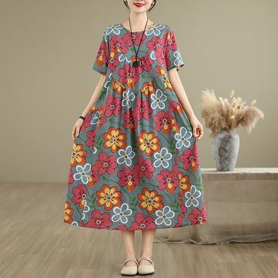 2025 Summer New Retro Printing Cotton and Linen Dress Women's Loose and Thin Round Neck Short-sleeved A-shaped Long Dress