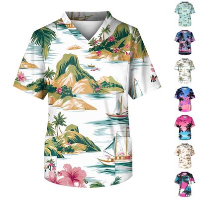 Men's Short Sleeve V-Neck Summer Print Chest Pocket Care Worker Top