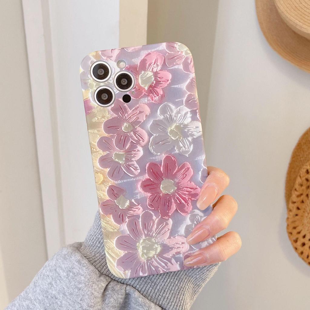 Pink Flower Oil Painting Silicone Case for iPhone 11/12/13/14 Pro Max/15 - Korean Style