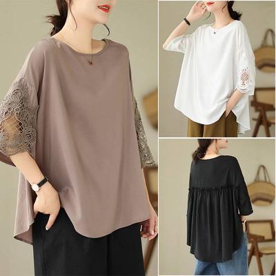 Large Size Women's Summer Fat Mm Belly Cover Top Slimming Loose Casual Lace Patchwork Short Sleeved T-shirt Blouses & Shirts