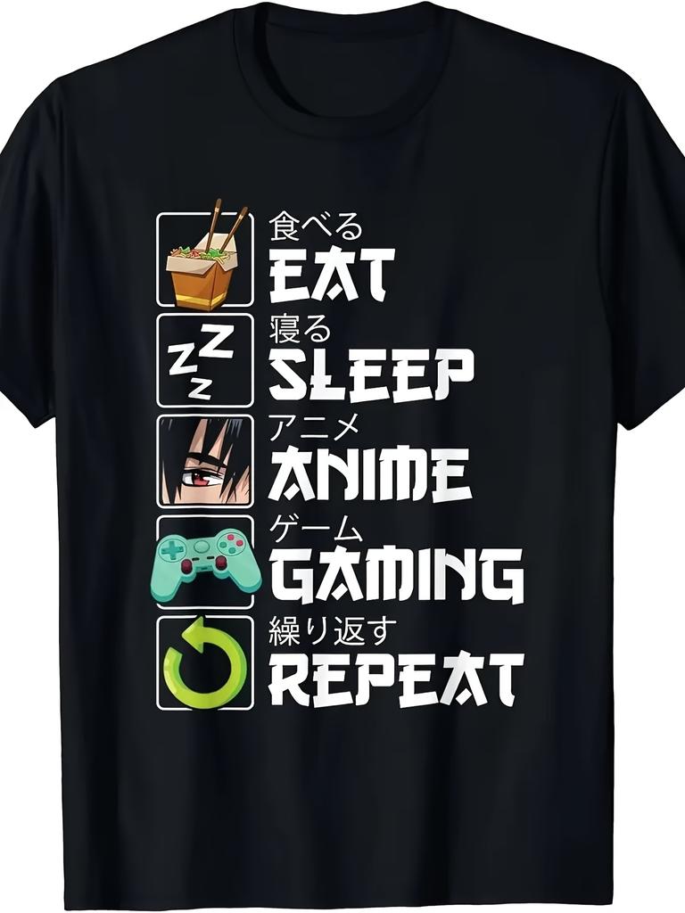 Men's "Eat, Sleep, Anime, Repeat" Graphic Tee - Short Sleeve, Crew Neck In Black with Colorful Icons - Casual Summer Wear