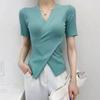 Irregular Cross Knit Short-sleeved Female Summer Bottoming V-neck Hundred Matching Solid Color Tops T-shirt Female Casual Slim Fit Pullovers Tees