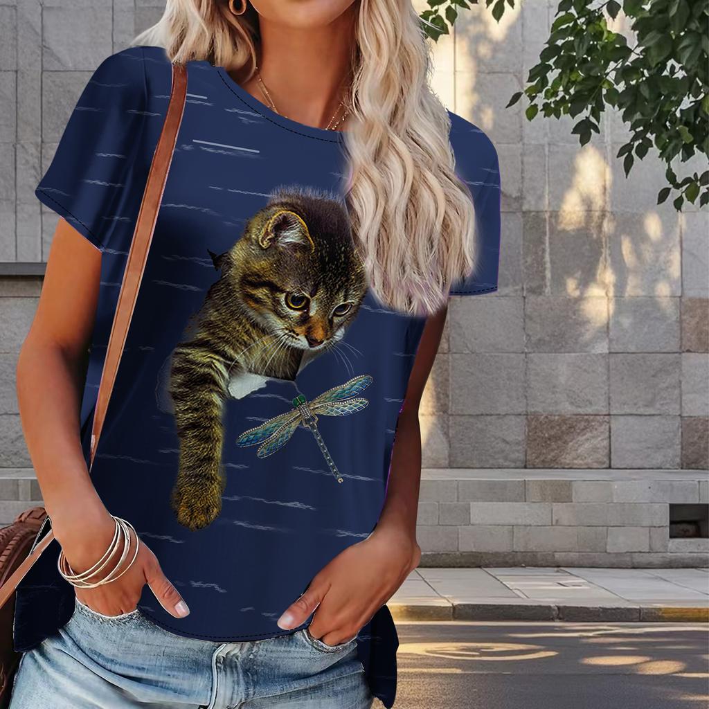 Women Summer T Shirt Kitty Print Retro Fashion Short Sleeve Tees Casual Printed Tops