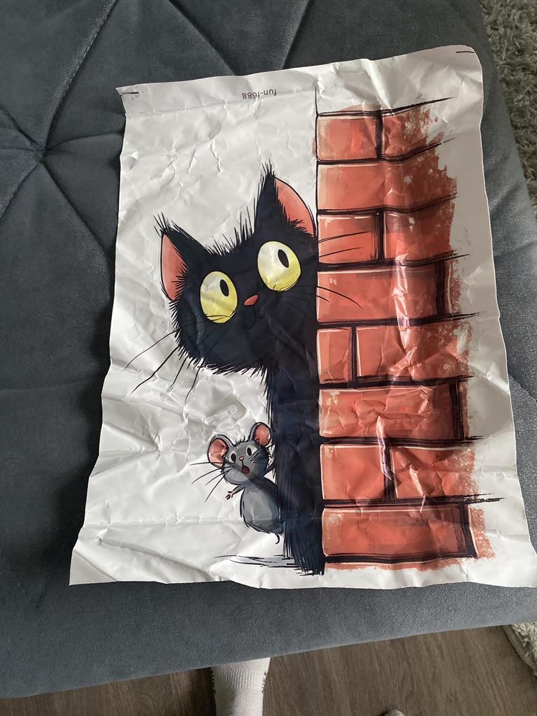 Cute kitten with a mouse. Arrived creased, but everything straightened out. I like it very much. Recommend.