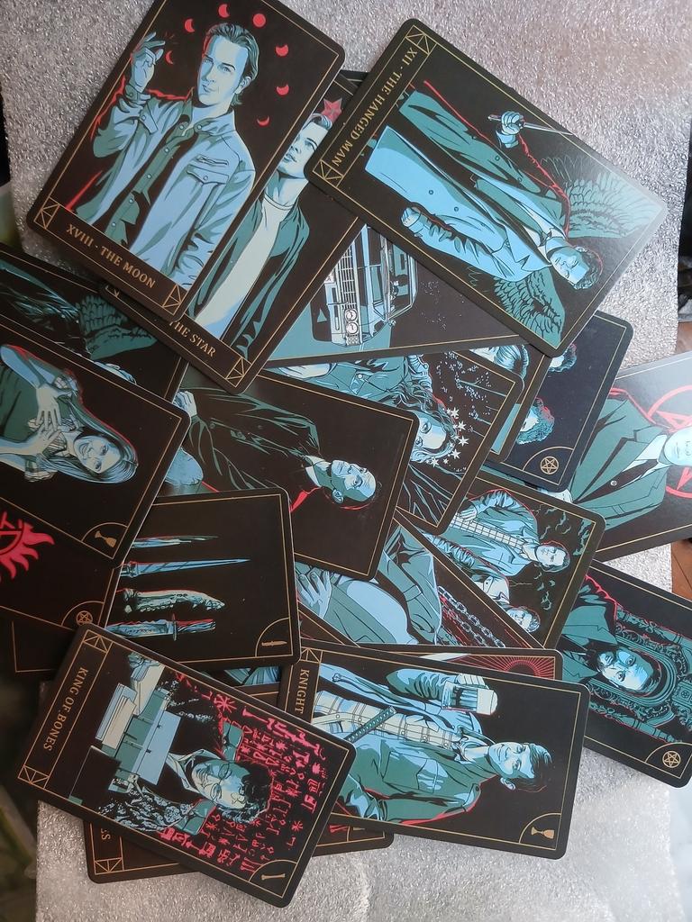 All the cards are different. Of good quality. They have cool prints in the style of "Supernatural" with the characters and themes of the series. They look simply like a work of art.