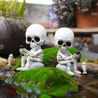 Skeleton Ornament Parent-Child Skull Fishing Design Hand-Painted Resin Figure Garden Pond Balcony Halloween Party Decor