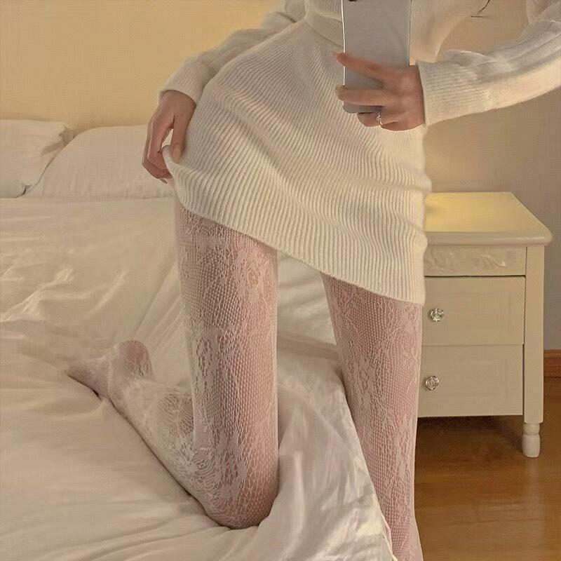 Sexy Black White Lolita Hollowed Lace Mesh Stockings Bottomed Pantyhose Japanese Goth Floral Rattan Stocking Hot Classic Tights