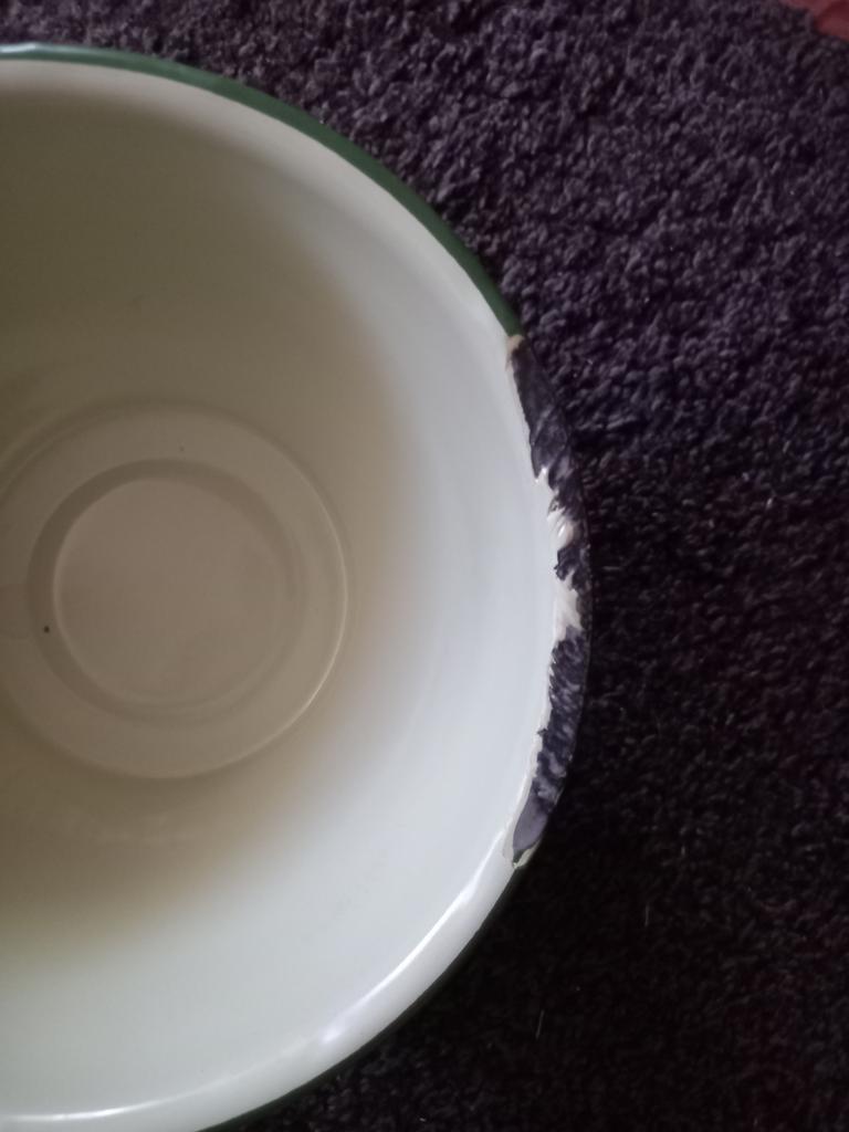 The bowl is very good, but the carriers squeezed the package somewhere and damaged the edge, not only the enamel but also the iron.