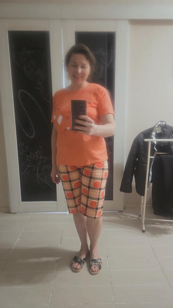A very cool pajama, very soft, the color is slightly brighter than in the picture. I am very satisfied. I wear size 50 just right.