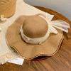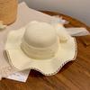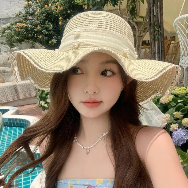 Wave Edge Lace Pearl Bow Straw Hat Women's Summer Seaside Sunshade Sunscreen Hat Large Brim Sun Hat Tide