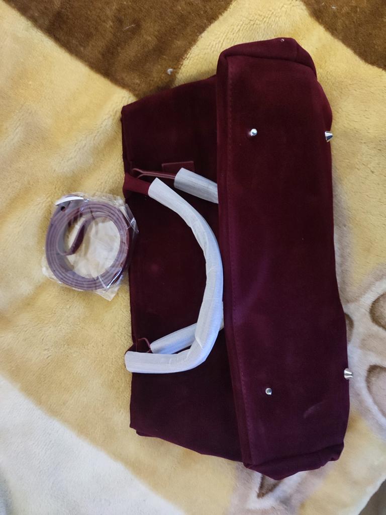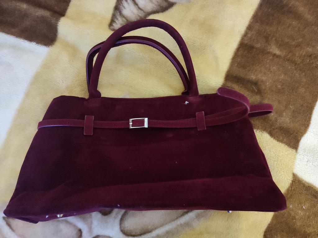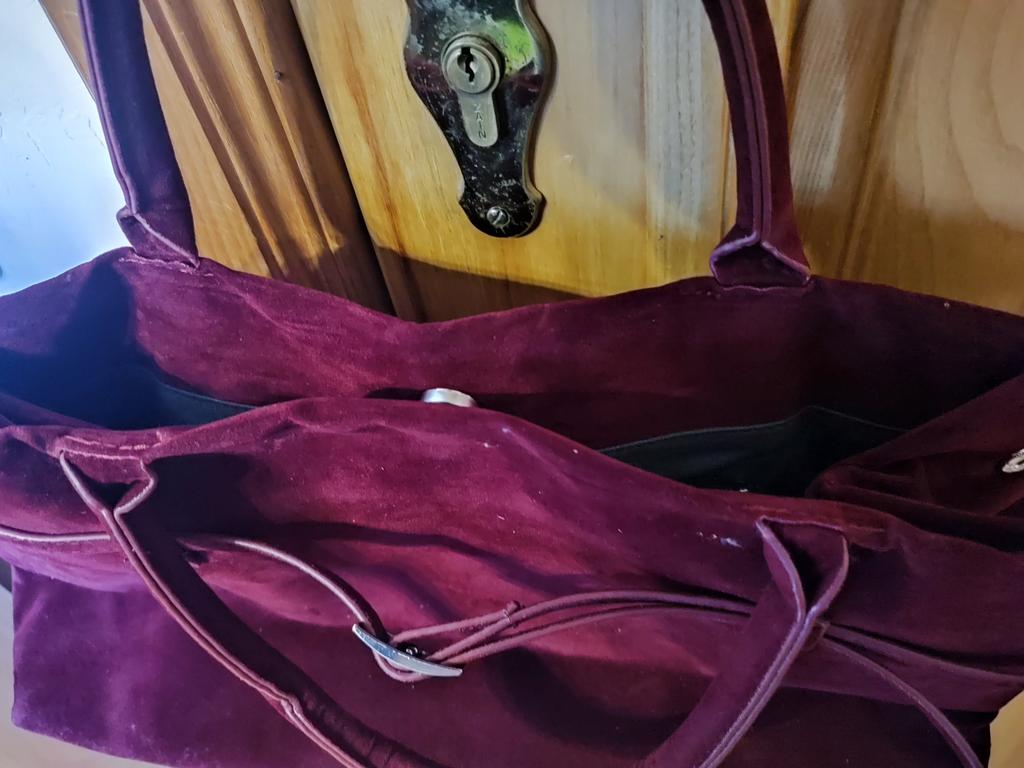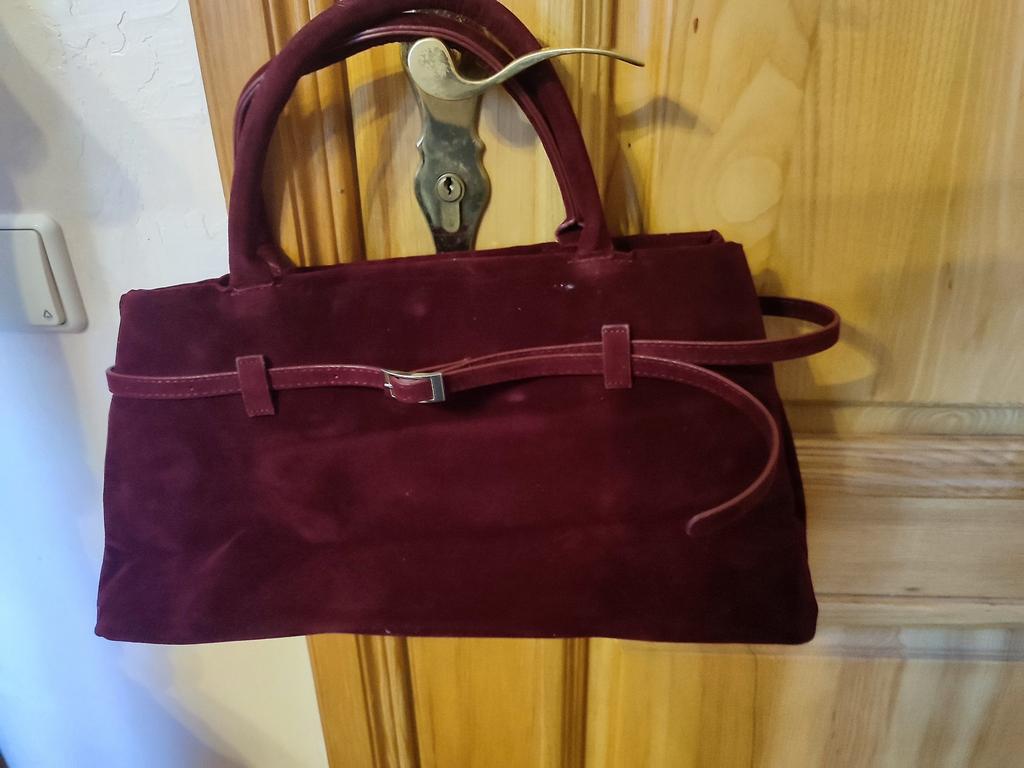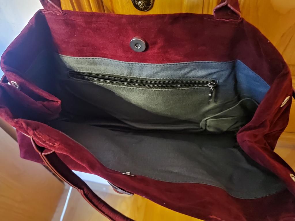 Very beautiful bag. The color is deep, cherry, rich. It closes with a button, inside there is one zippered pocket.