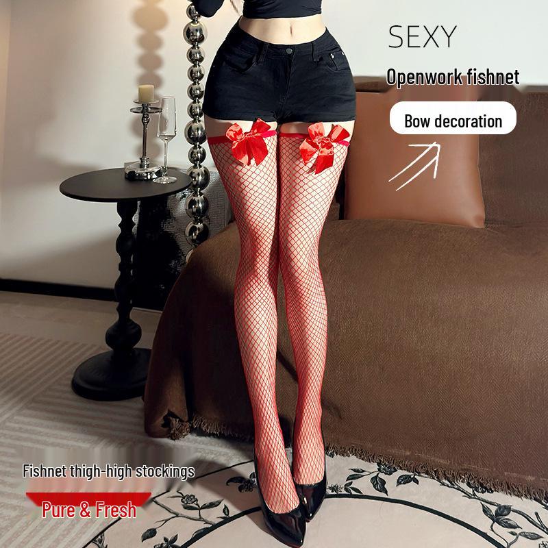 Women's Sweet Bow Fishnet Over-the-Knee Socks, Openwork Jacquard, Thin Summer Stockings, Anti-Ladder, Large Mesh