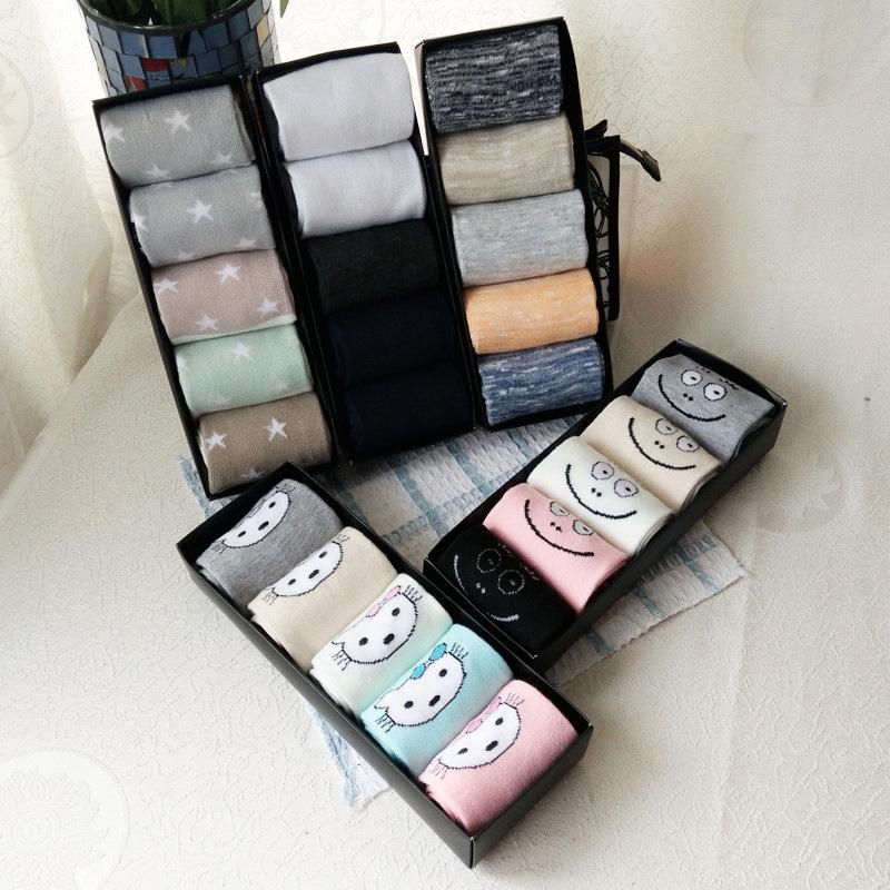 Men's and Women's Mid-Calf Cotton Socks - 5 Pairs, Autumn/Winter, Jacquard Cartoon Design