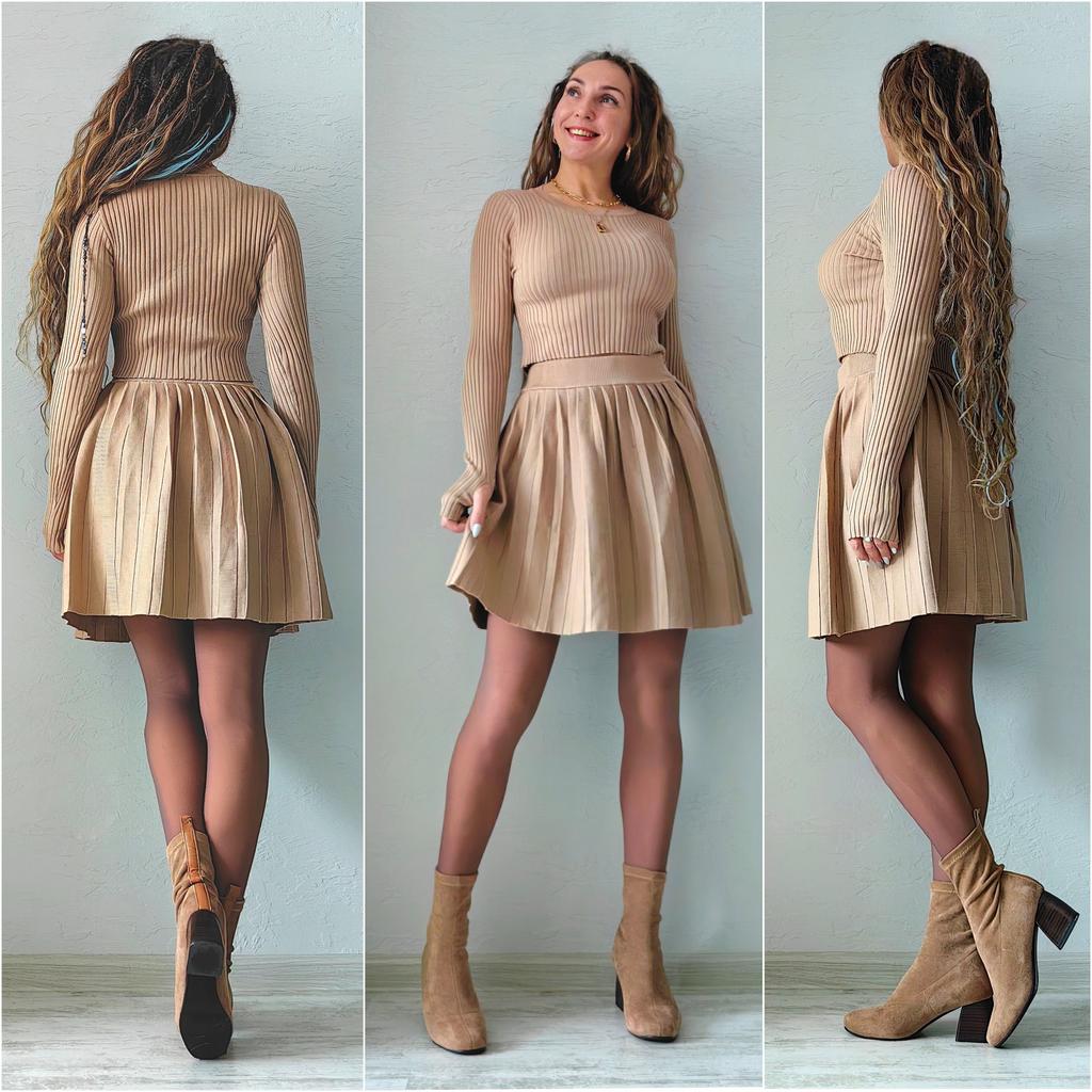 RUGOD New Women's Fashion Long Sleeve Corset Pleated Mini Skirt Short Skirt Women's Knitted Sweater Two Piece Set
