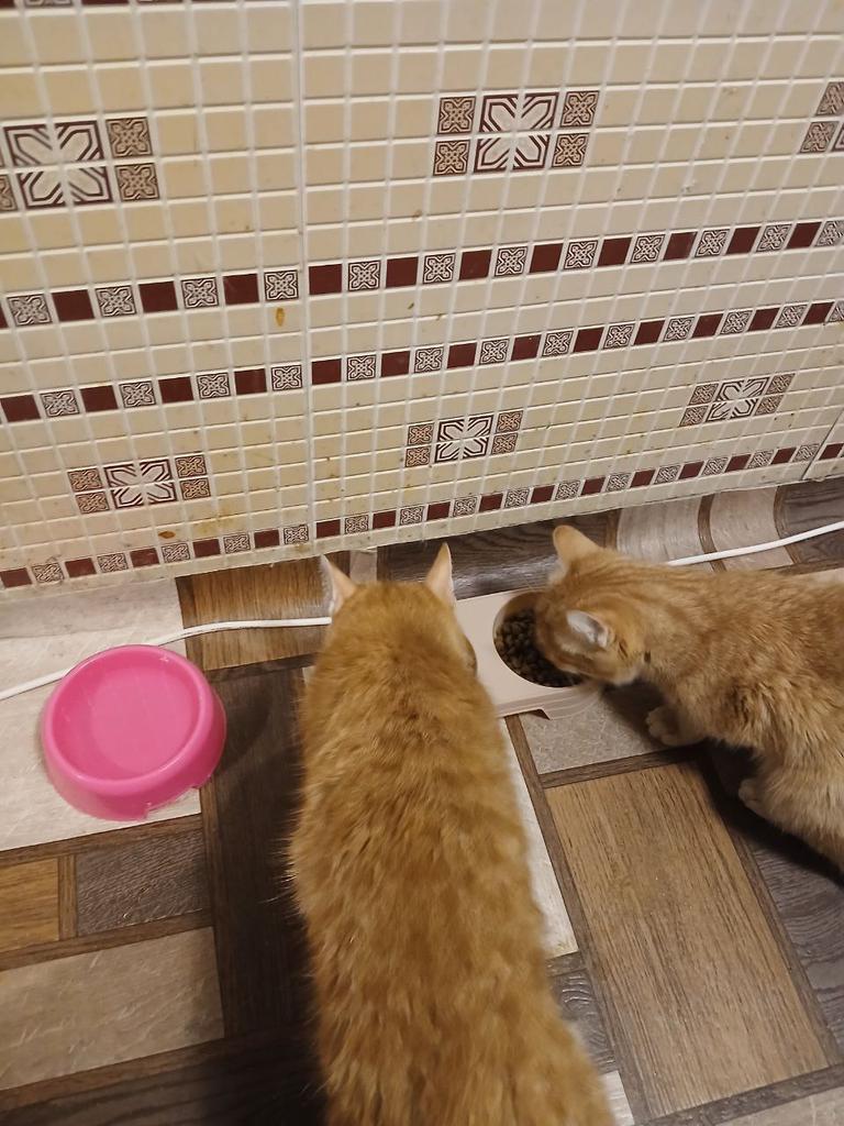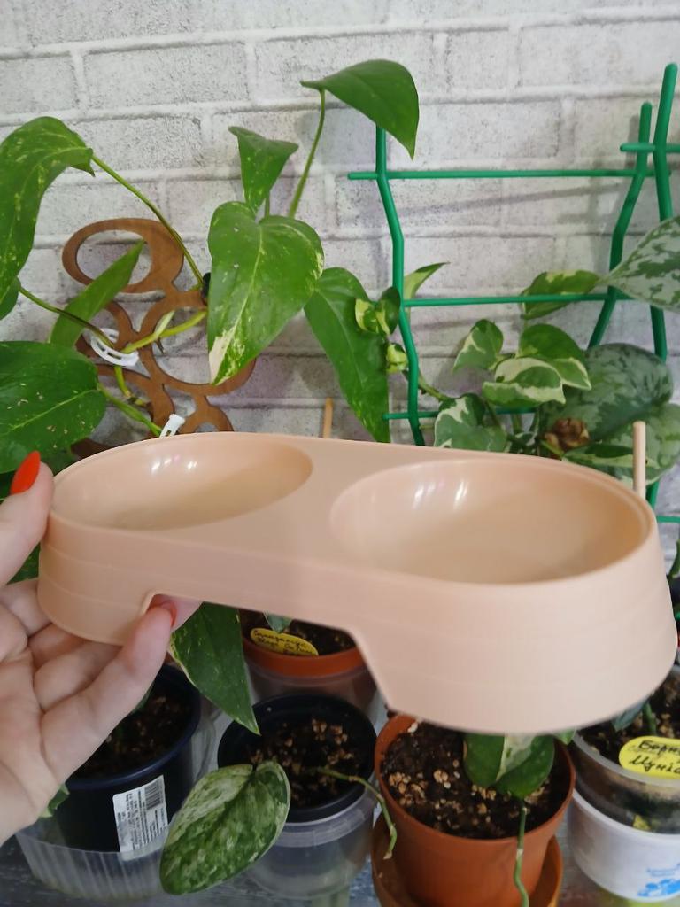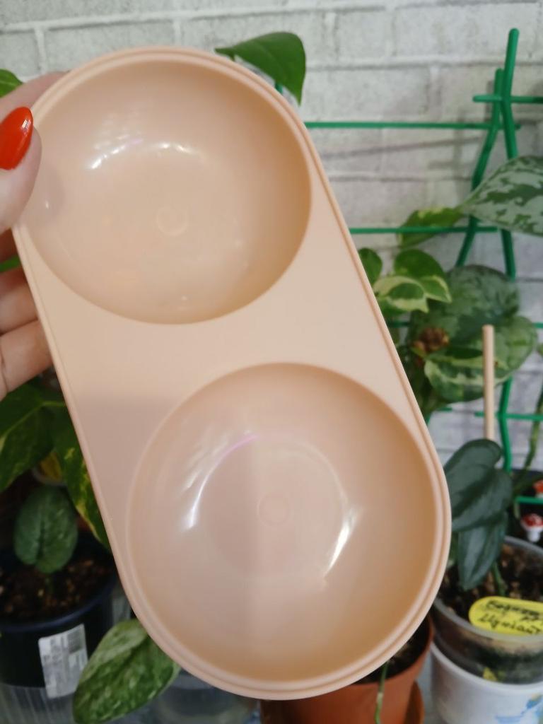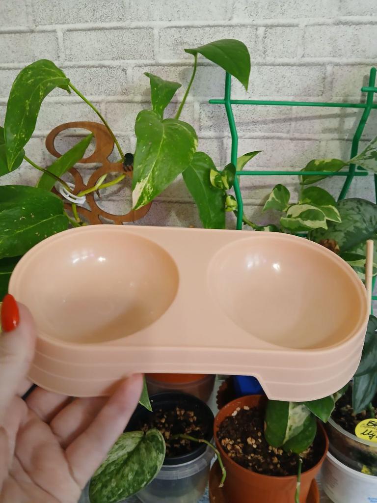 Double pet bowls are used to hold food and water simultaneously. Type: Double bowls, ideal for cats or small dogs. Material: Made of plastic. Colors: Available in various pastel colors, including orange, purple, mint green, and light yellow. Purpose: A convenient feeding solution that allows you to keep food and water in one place. I recommend.👍