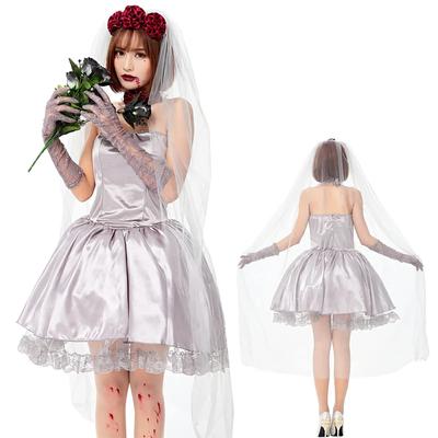 Milky Time Women's Sexy 4-Piece Silver Zombie Bride Dress with Rose Veil for Halloween Cosplay