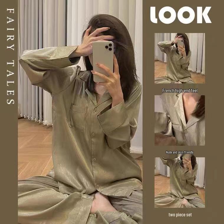 Indulge in luxurious comfort with this exquisite olive green cardigan pajama set, designed for women who appreciate both style and quality. Crafted from premium silk, this set offers a sumptuous feel against the skin, making it ideal for autumn's gentle chill. The long-sleeved, turn-down collar design enhances its sophisticated appeal, perfect for unwinding at home while maintaining an elegant look. Elevate your homewear collection with this chic and timeless addition.