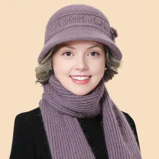 2Pcs/Set Women Hat Scarf Set Solid Color Flower Decor Elastic Knitting Basin Hat Warm Long Scarf Set Cold Weather Accessories
