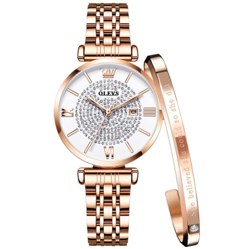 OLEVS Women's Watch, Simple and Casual, Date Display, Waterproof, Rose Gold with Diamond Dial, Double-Flip Closure, Wine Red, Gift