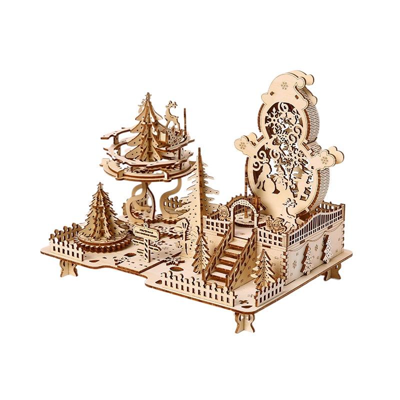3D Wooden Puzzle Christmas Amusement Park Deer Carriage Music Box with Light Assembly Toy for Kid DIY Decoration for Gifts