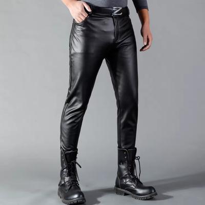 Men Pants Faux Leather Smooth Solid Color Slim Fit Pockets Mid Waist Soft Breathable Elastic Motocycle Streetwear Club Long Trousers