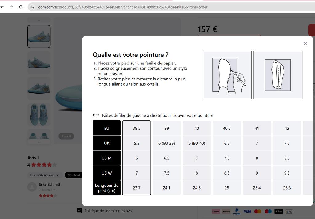 We have received the shoes, however we have noticed an error regarding the size.. According to the reference chart indicated on your website (see attached photo), for a size 38.5, the corresponding length is 23.7 cm. Or, inside the shoe received, it is indicated 24 cm (see attached photo). Furthermore, once tried on, the shoes seem noticeably larger than expected, which confirms that the actual length is greater than expected for a size 38.5.. Could you tell us how to proceed to correct this situation?