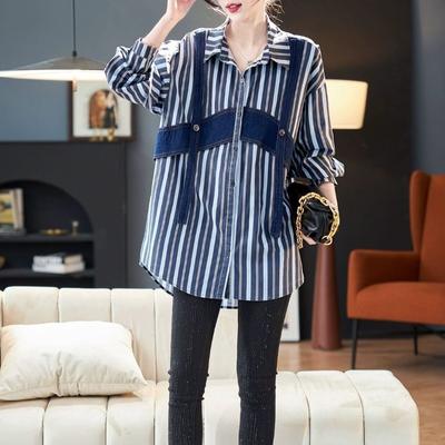Long Striped Shirt Women's Loose Fit Korean Style Blouse with Patchwork