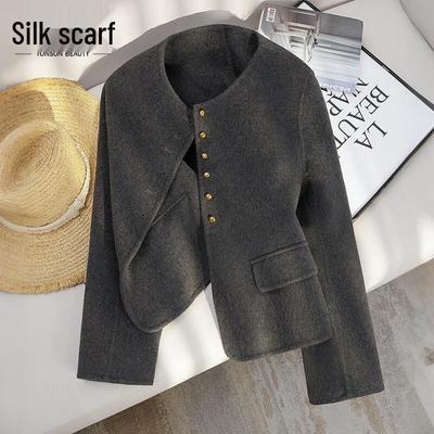 SILUBAI SHE Women's Round Neck Single-Breasted Wool Blend Double-Faced Coat