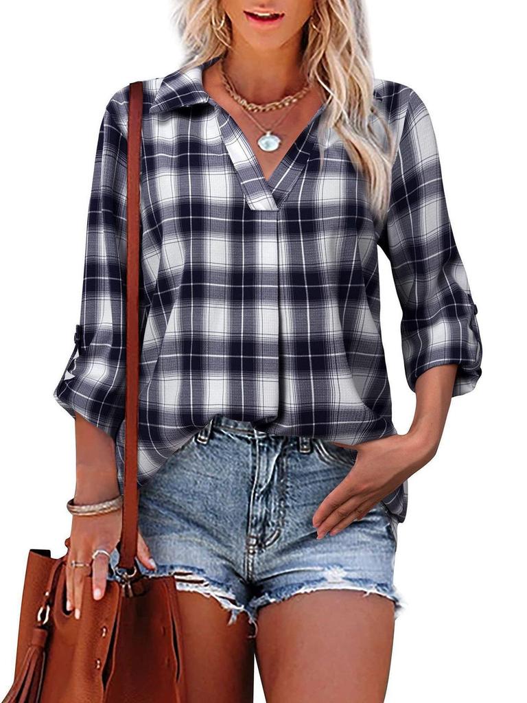 2025 V-Neck Long-Sleeve Plaid Lapel Loose-Fit Women's Pullover