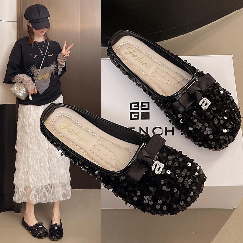 Flat-bottomed Slippers Women's New Bow Retro Large-size Sandals Bag Head Half Slippers Women's Summer
