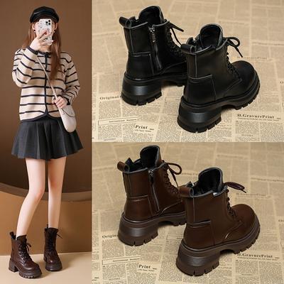 Fashion Autumn Winter Fleece-Lined Round Toe Leather Platform Ladies Mid Calf Shoes Chic and Elegant with Laces Women's Half High Boots
