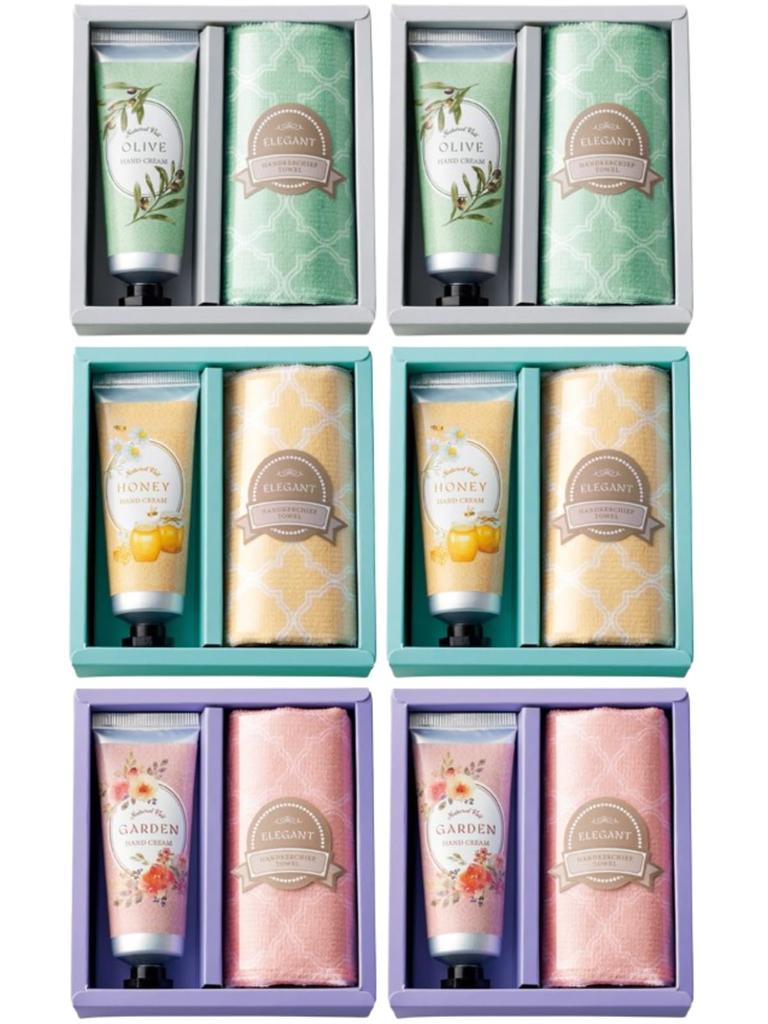 Set contents: Hand cream & fluffy handkerchief towel set of 6 (2 of each color) + 6 message cards