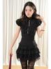 Vintage Slimming Black Lace Two-Piece Set: Short Sleeve Shirt & Layered Mini Skirt