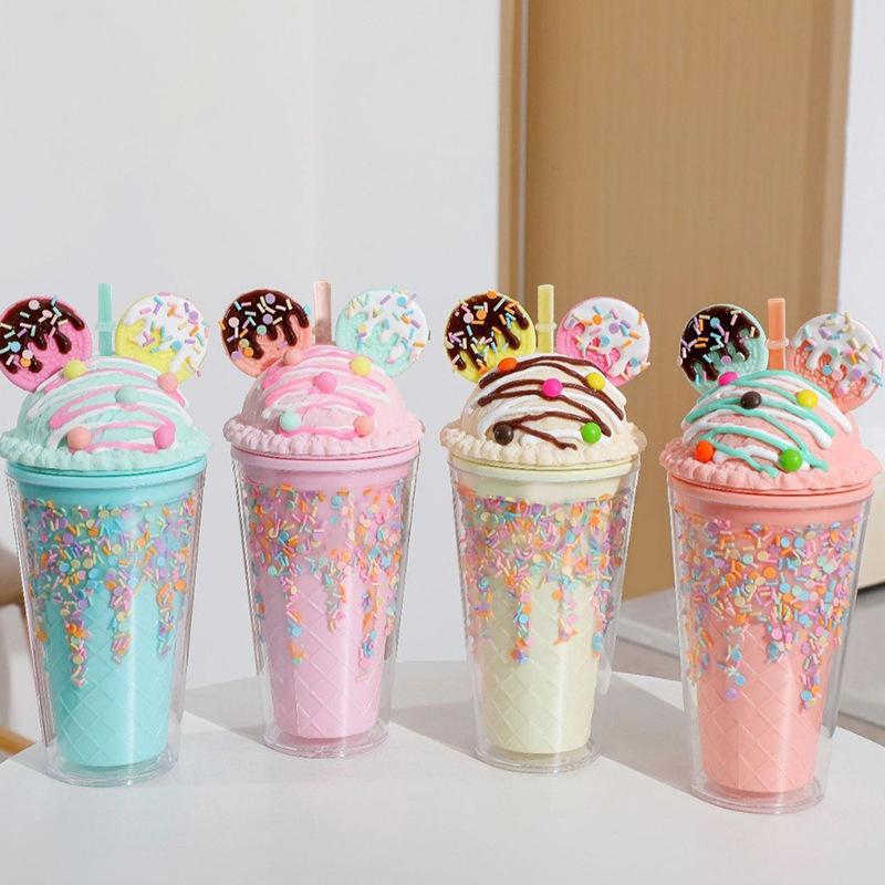 450ml Cute Straw Cup,Ice Cream Lids for Stanley Tumbler,Reusable Plastic Cups,Summer Drinkware Cold Brew,Girl Water Bottle Gift