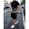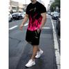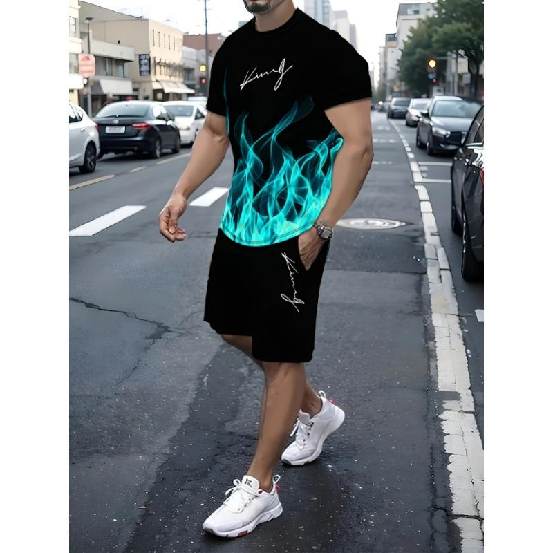 Flame Pattern "King" Print, Men's 2-piece Set, Summer Casual Round Neck Short Sleeved T-shirt and Drawstring Shorts Set, Home and Vacation Outfit