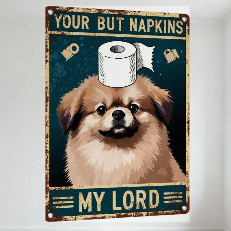 Vintage Distressed Metal Tin Sign 'YOUR BUT NAPKINS MY LORD' with Dog & Toilet Paper, Teal Background, Home/Bar Decor