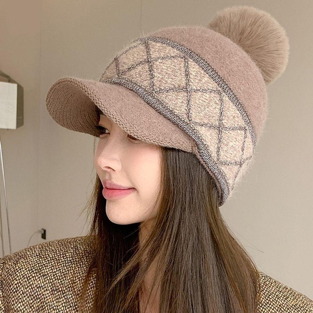 Argyle Pom Pom Hat with Rabbit Fur Ears and Winter Cap