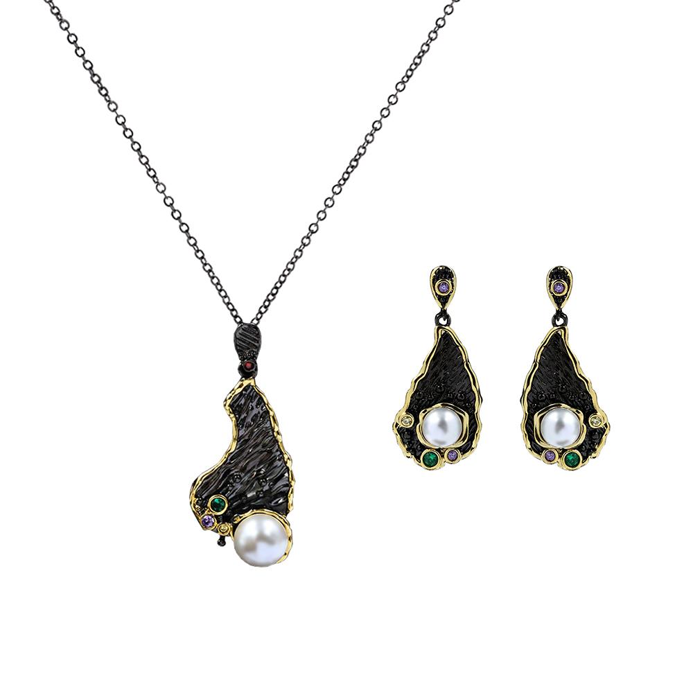 Vintage Jewelry Set for Women Black Gold Freshwater Pearl Pendant Necklace Earrings Bridal Party Jewelry Italian Jewelry