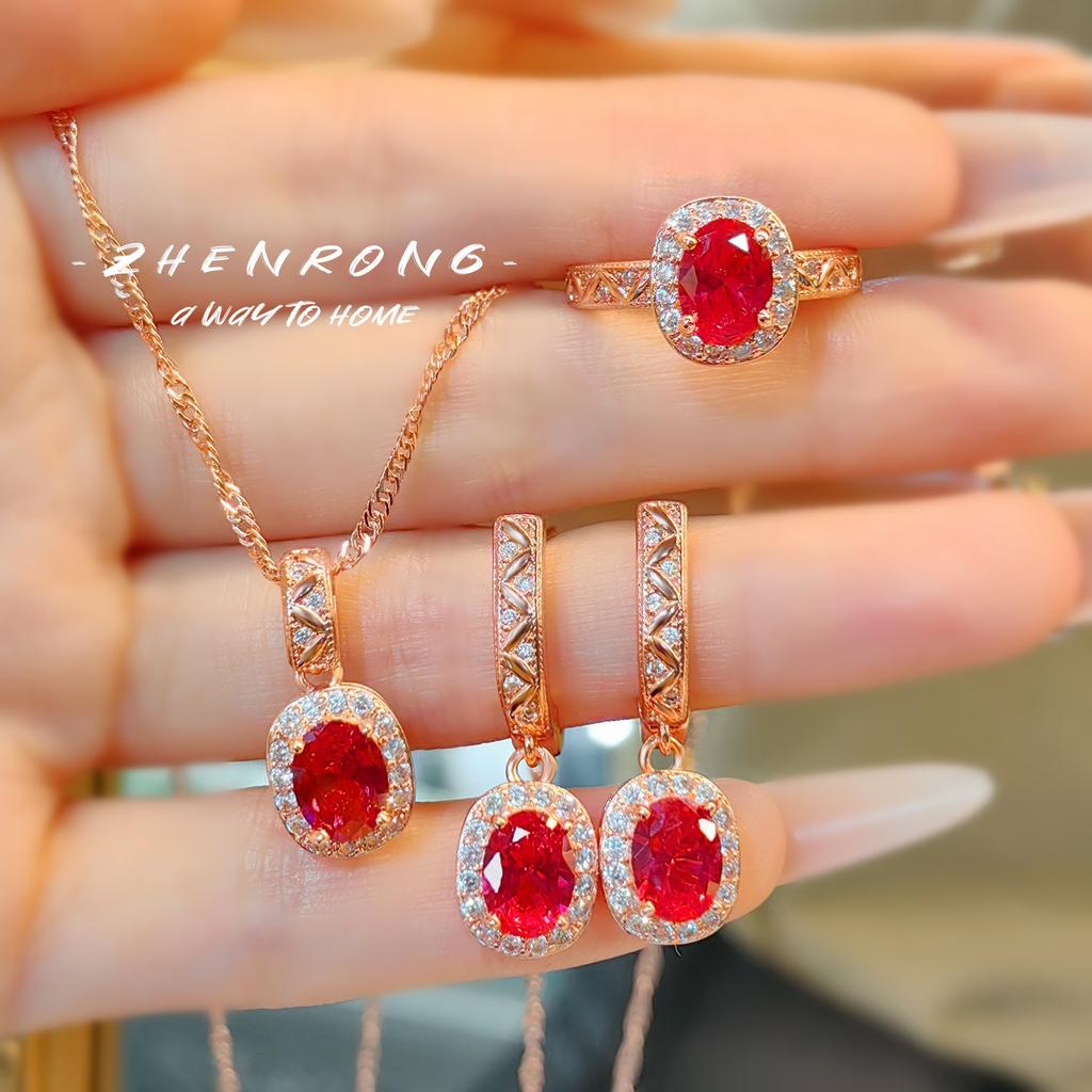 Luxury Rose Gold Plated Oval Ruby Zirconia Fashion Jewelry Sets Sparkling Crystal Female Banquet Ring/Earring/Necklace Chain