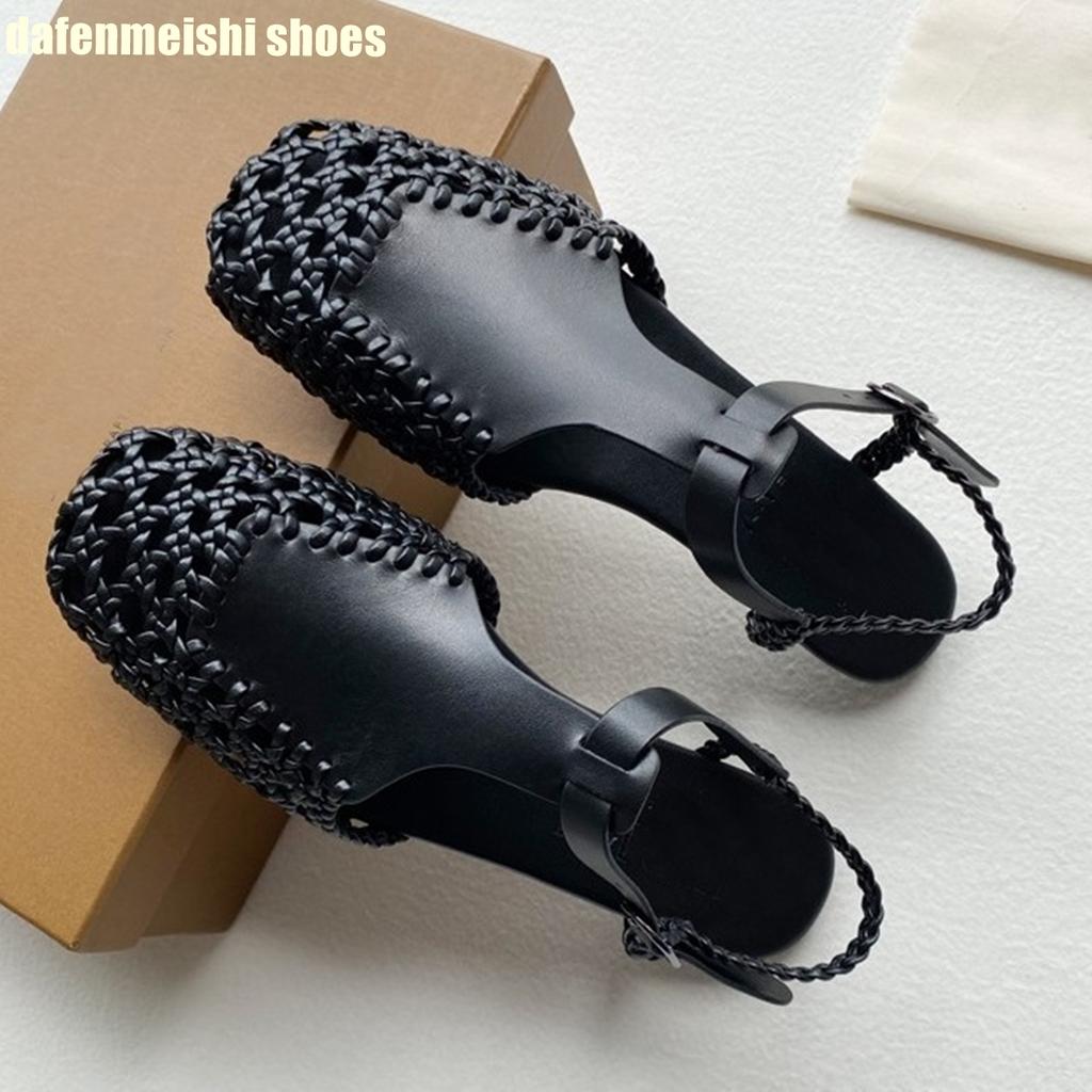 Fashion Flat Genuine Leather Woven Sandals Women's Hemp Rope Square Toe Summer Roman Shoes Singback Solid Color Fashion Shoes