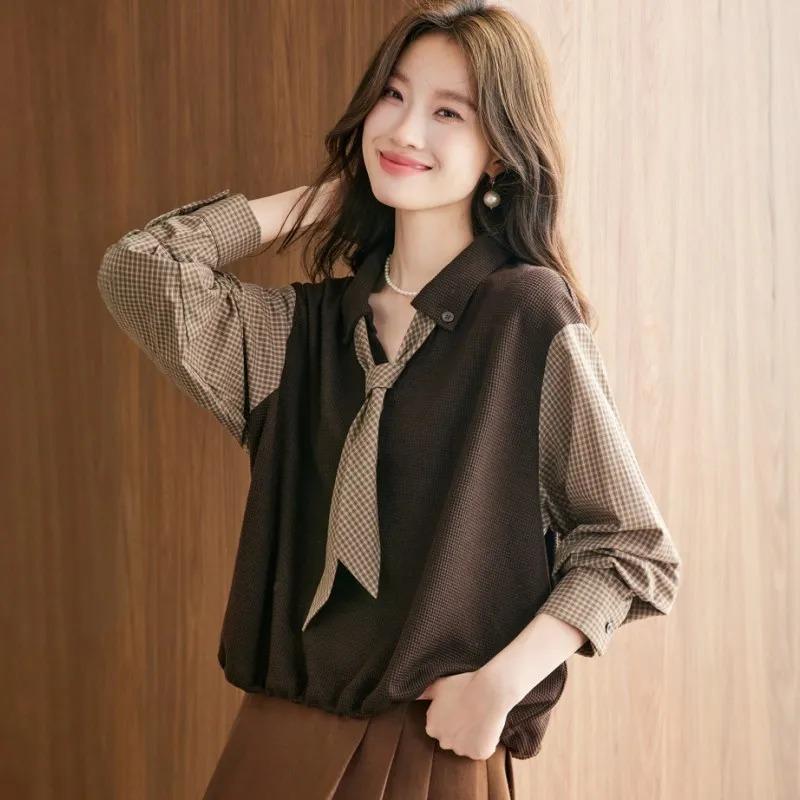 Autumn New Fashion Style Age-reducing Loose Belly-covering Bow Knitted Patchwork Shirt Top for Women