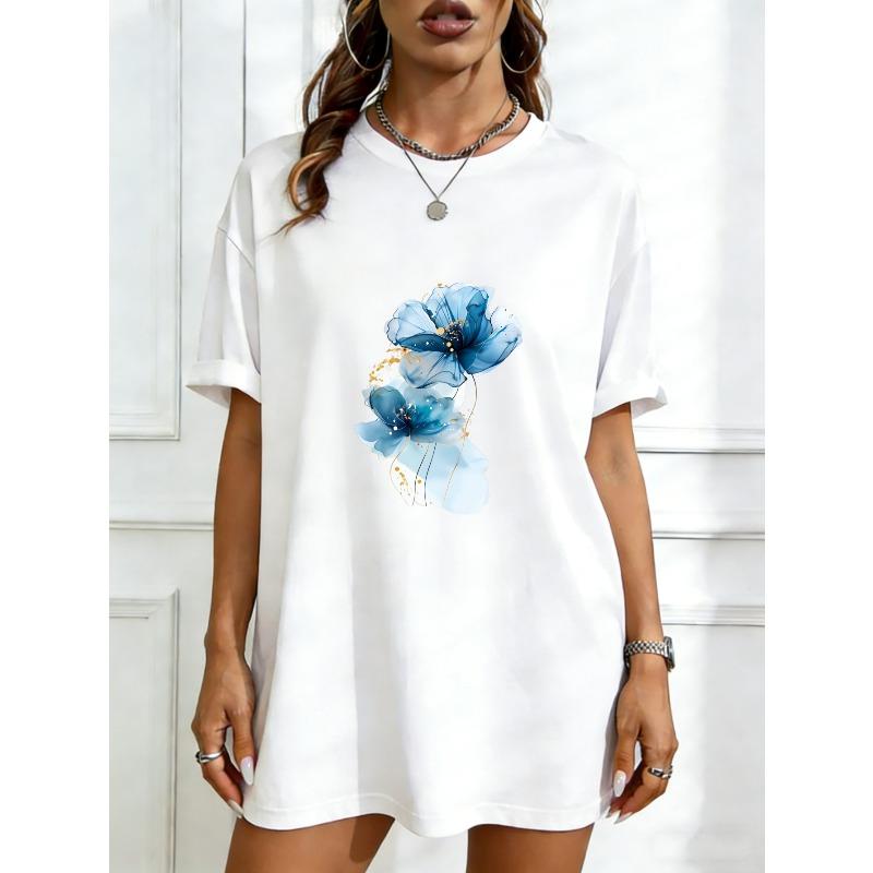 Oversized T Shirt Dress Black Blue Floral Print For Casual Wear