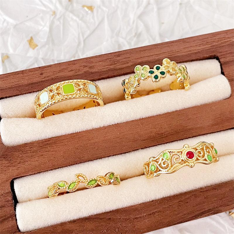 Retro Gold Enamel Open Ring Pattern Niche Design Inlaid Fashion Elegant Exquisite High Sense Ring Women
