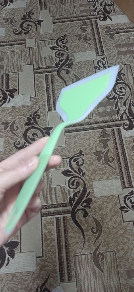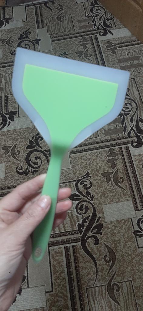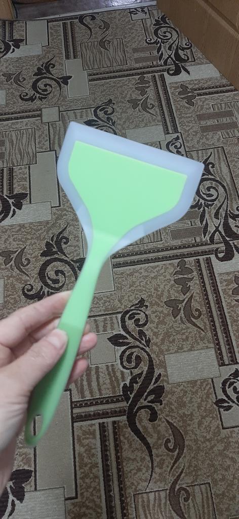 ❤️👍I use a silicone spatula for a non-stick frying pan. The color is light green with a white trim — it looks neat and pleasant, easy to find among kitchen utensils. The silicone is soft and does not scratch the pan surface, which is important for the non-stick coating. The spatula is suitable for everyday cooking.. Moderately flexible spatula: convenient for flipping and stirring food. Comfortable to hold, does not slip. Easy to wash, food residue does not stick. Does not absorb odors during normal use. A practical and convenient silicone spatula that is gentle on non-stick coatings and pleasant to use. I recommend it for everyday use in the kitchen.