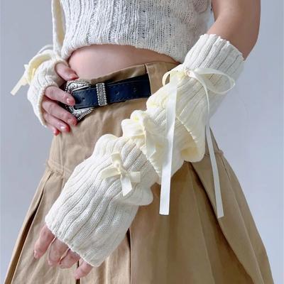 Female Y2K Fashion Arm Warmers Bowknot Soft Knitted Gloves Women Girl Half Finger Mittens Solid Color Thicken Arm Sleeves